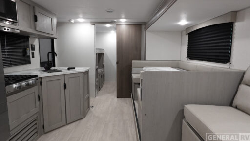 Everything you've been looking for in a travel trailer is found with this unit! The 21' power awning can be set up when you get to the campground, then you can unload the pass-thru storage. Once inside, you can put your things away in the front master bedroom that includes an RV queen bed and dual bedside wardrobes, plus you'll have a private entrance into the dual entry bath. The bath also includes one of the dual entry doors to the unit to make it easier to use when you're spending time outdoors. In the combined kitchen and living area you'll find a large slide out, a U-shaped dinette and sofa, plus a pantry with washer and dryer prep if you plan to go full-time. Another great feature on this travel trailer is the rear private bunkhouse! There are 28" x 72" bunk beds across from 38" x 72" bunks so your guests have a place to sleep!