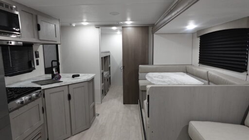Everything you've been looking for in a travel trailer is found with this unit! The 21' power awning can be set up when you get to the campground, then you can unload the pass-thru storage. Once inside, you can put your things away in the front master bedroom that includes an RV queen bed and dual bedside wardrobes, plus you'll have a private entrance into the dual entry bath. The bath also includes one of the dual entry doors to the unit to make it easier to use when you're spending time outdoors. In the combined kitchen and living area you'll find a large slide out, a U-shaped dinette and sofa, plus a pantry with washer and dryer prep if you plan to go full-time. Another great feature on this travel trailer is the rear private bunkhouse! There are 28" x 72" bunk beds across from 38" x 72" bunks so your guests have a place to sleep!