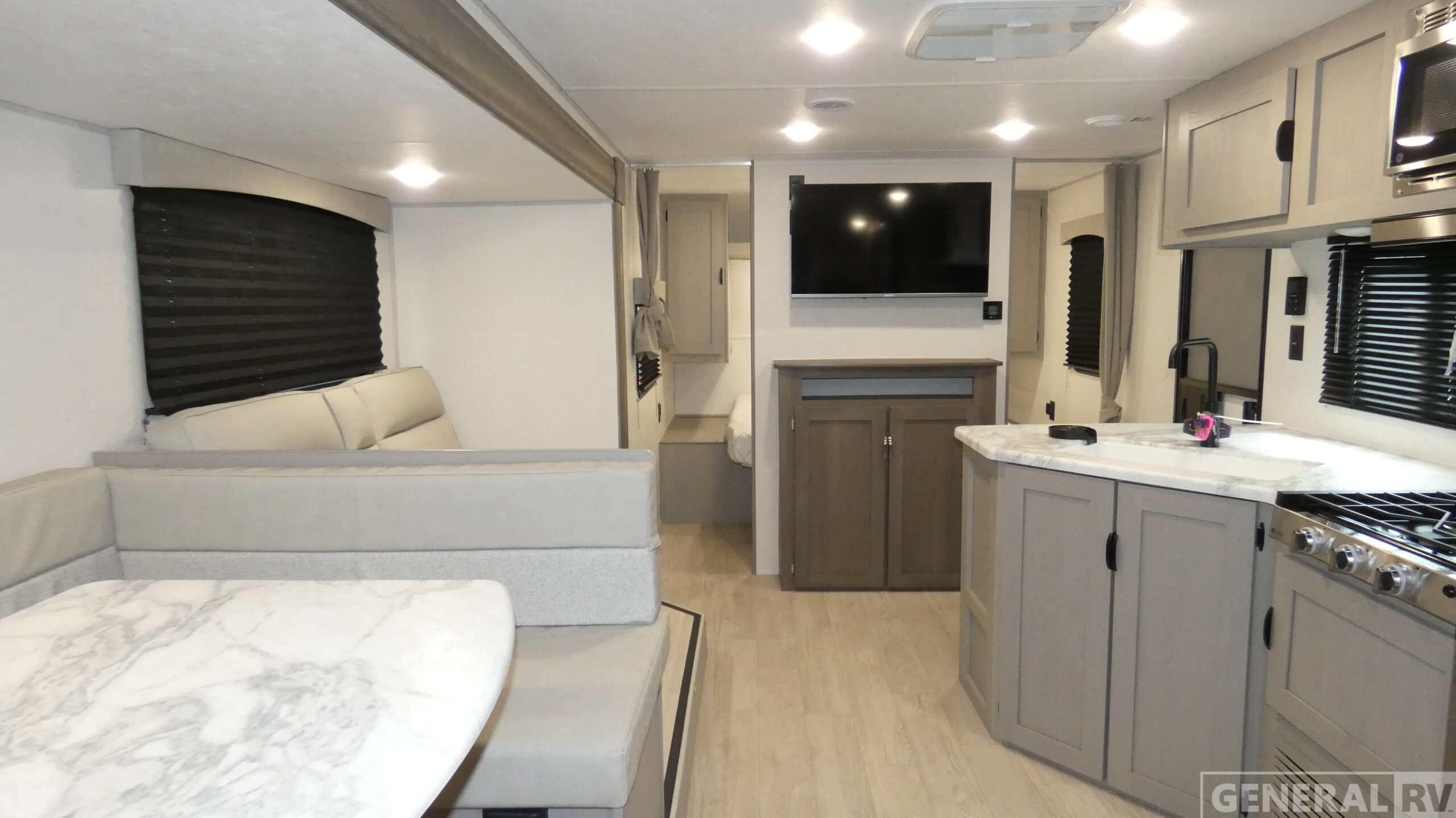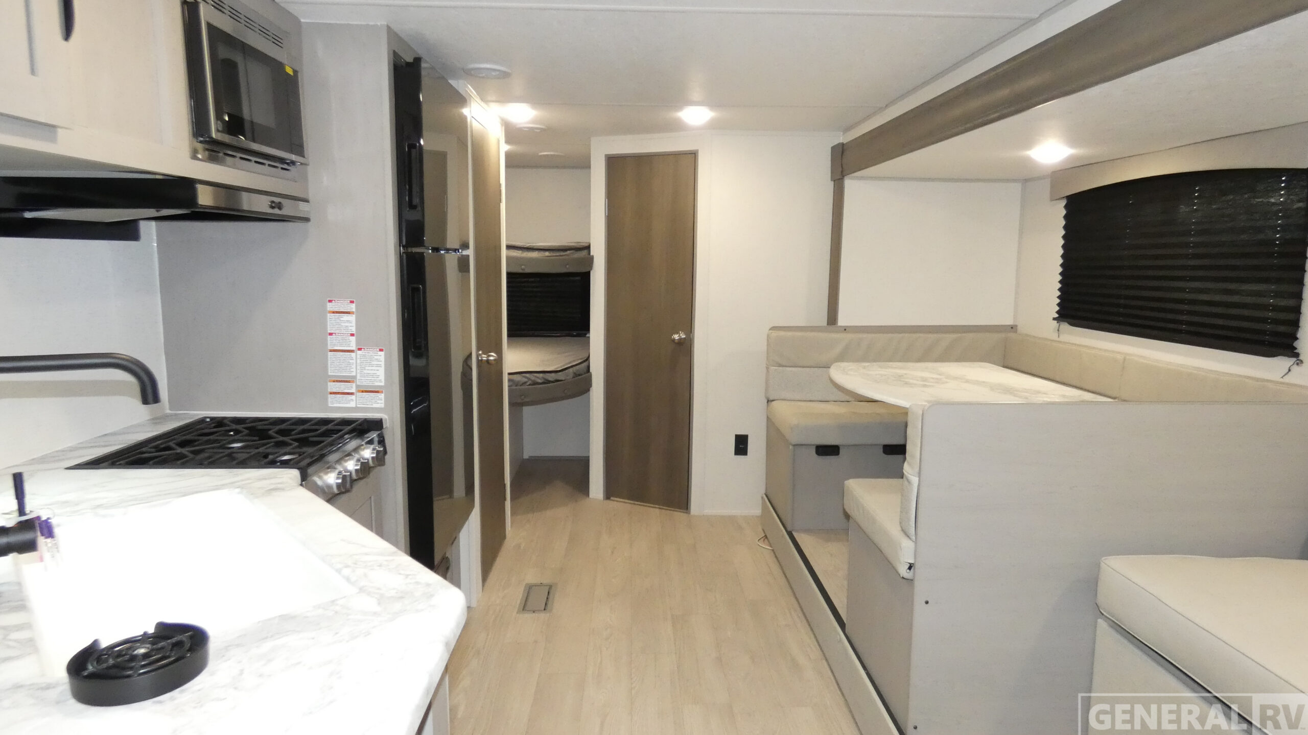 You won't believe all that this travel trailer has to offer! Starting with the front bedroom including a 60" x 74" RV queen bed that has wardrobes on either side. The rear corner bathroom has a great 24" x 36" shower to freshen up in each morning. The chef can prepare their best meals using the three burner cooktop and microwave oven. and store the leftovers in the 10 cu. ft. 12V refrigerator. You can enjoy your meals together at the U-shaped dinette and then play cards or a board game. There is also a sofa to relax on, and the kids will love the steps up to a double- size set bunk beds!