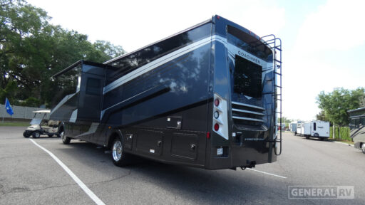The master suite is a retreat in itself, featuring a luxurious 70" x 74" king bed with a storage system, ensuring you have plenty of room for all your essentials. The kitchen is a chef's delight with a farm sink, refrigerator, and ample pantry space, all designed to make meal preparation a breeze. With a 70-gallon fresh water capacity, you can enjoy extended trips without the need for frequent refills. The Encore 355DS is built on a robust Ford F53 chassis powered by a 7.3L V8 engine, ensuring a smooth and powerful drive. For more information or to see this beauty in person, visit your nearest General RV dealership.