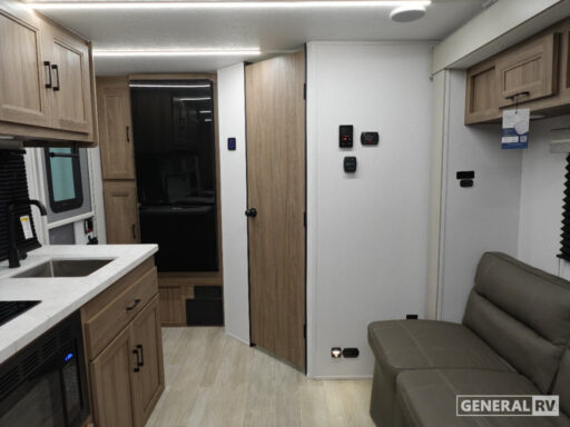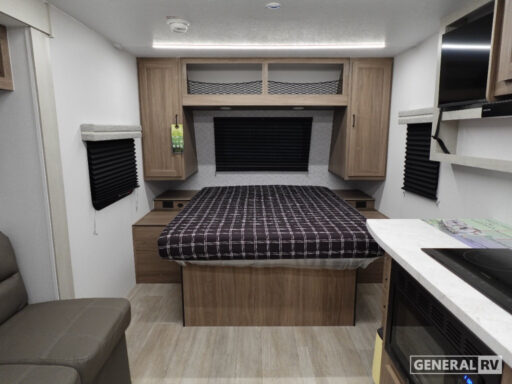 Retreat to the inviting rear bath, complete with a practical shower and plenty of storage. The front of the trailer features a luxurious queen bed, offering under-bed storage and surrounded by wardrobes for all your essentials. Enjoy the outdoors under the 14-foot powered retractable awning, perfect for al fresco dining or simply soaking up the scenery. With a generous cargo capacity and pass-through storage, this RV is ready for any adventure you can dream up. For more information or to see this model in person, visit your nearest General RV dealership.