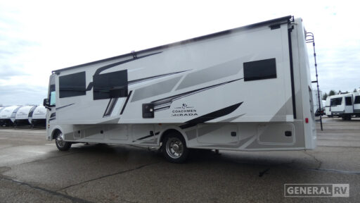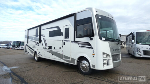 Each Mirada Class A gas motorhome by Coachmen is constructed with a crowned, laminated fiberglass roof with Azdel Superlite composite for added durability, along with high gloss gelcoat sidewalls. There is a 7.3L V8 engine on a Ford F53 chassis for power you can feel, and a 10" touch screen radio with AM/FM radio with Bluetooth capability. The 5.5 kW gas generator, dual coach batteries, and 100W solar panel with a controller will meet all your power needs, and the automatic leveling jacks make setting up camp a breeze. Head inside to find premium linoleum throughout, hardwood cabinet doors, kitchen tile backsplash, and solar privacy shades throughout to name a few comforts. The open road is yours for the taking in a Mirada Class A gas motorhome!
