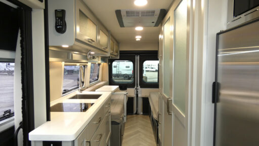 Hit the road and enjoy each journey in this Nova Class B coach. Once you park for the day, you can swivel the captain's seats around and utilize the swivel table. Lunch can be made on the induction cooktop, and the cold ingredients can go back in the 7.3 cu. ft. refrigerator. The convenient wet bath allows you to freshen up after a day exploring, and when you're ready to turn in for the night you can choose from either two 75" x 26" beds, or combine them to create a 75" x 73" bed instead. You will find ample storage in overhead cabinets along each side, beneath the bed, plus there is an extra wardrobe on the roadside as well.