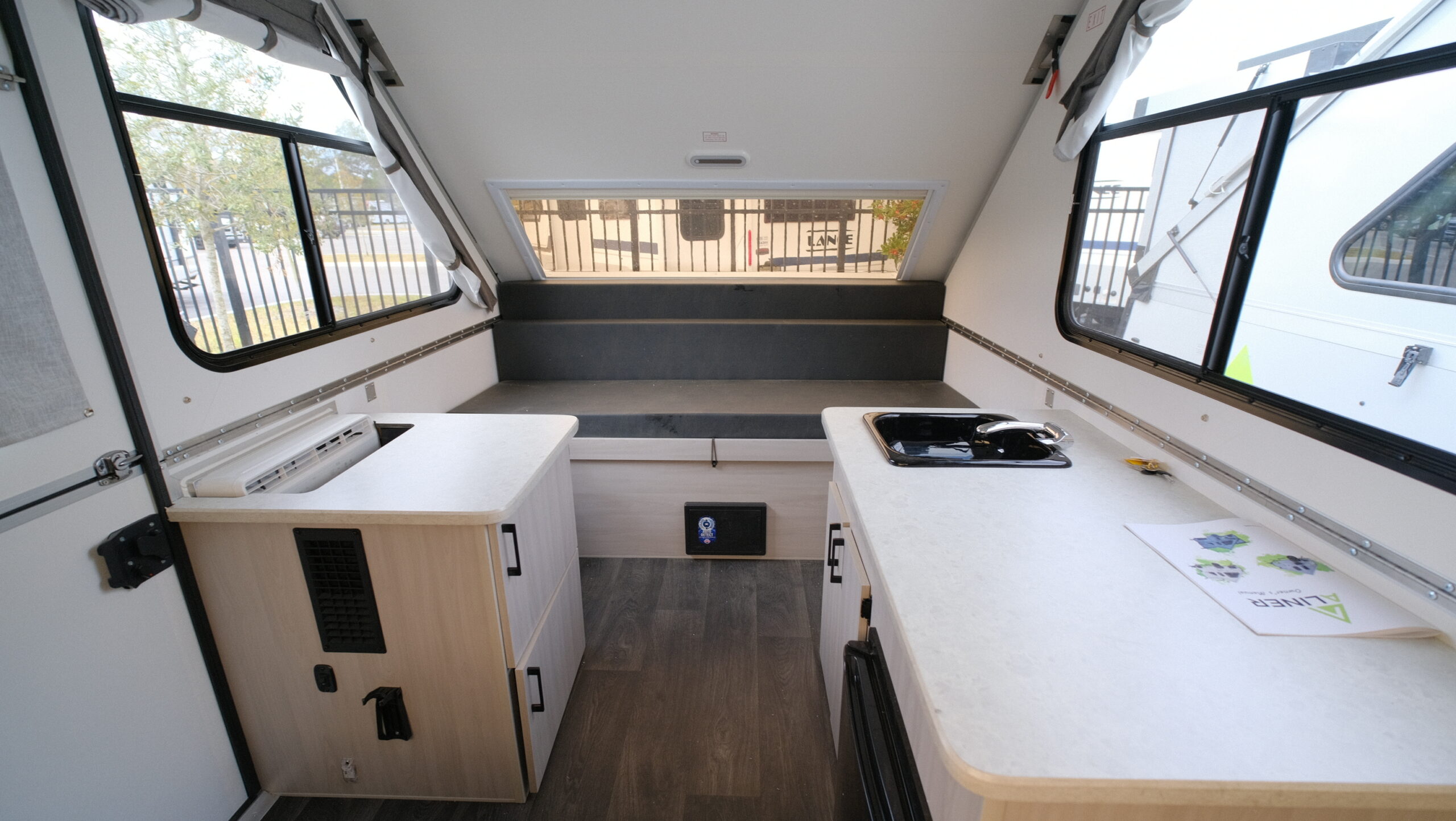 When all you need is the basics to camp, this Scout Lite will be perfect for you! There is sleeping space on either the front 30" x 76" bed or the rear dinette which converts into a 40" x 76" bed. There is plenty of storage throughout between the storage under the front bed, under the sink, and the exterior baggage door. And you can keep everything charged with the two electrical outlets inside and the one exterior electrical outlet!