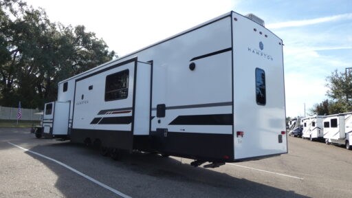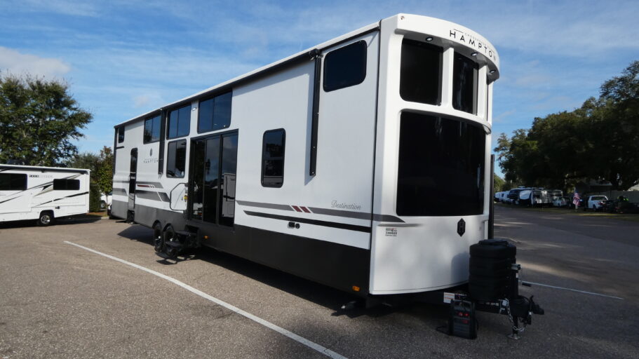 Large holding tanks and dual A/C units keep you comfortable in all seasons, while the 20′ power patio awning with LED lighting creates an inviting outdoor living space. With generous storage, solid construction, and thoughtful features throughout, the Hampton 410PVL delivers the perfect home-away-from-home experience for families and long-term travelers.
