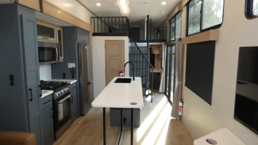 Prepare meals with ease in the well-equipped kitchen, complete with a residential-style 18 cu ft refrigerator, four-burner range, and ample counter space. The full bathroom includes a standard RV shower and toilet, making everyday living simple.