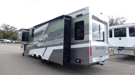 You are going to wish you found the Redwood fifth wheels sooner! With all of the residential comfort and modern luxury, you will be impressed. The Franklin Furniture Collection includes two premium dinette chairs, a buffet-style adjustable dinette with leaf extension, an 80" sofa, and powered theater seating. The luxury further extends to the bedroom where you will find a gel-foam king bed with tilt and C-PAP shelves on both sides of the bed. The straight roof line gives a luxury profile, and there are preparations for a wireless backup camera as well as solar power. The seamless residential insulated heat ducts will efficiently heat your unit, and there is an exterior radio in the fully finished and heated pass-through with slat board storage.