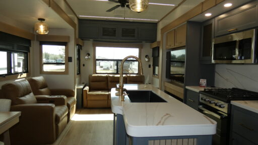 You’re going to love how this floorplan blends true residential comfort with smart, everyday livability. The rear living area feels made for real downtime with theater seats, a tri-fold sofa, and a fireplace that sets the tone for cozy nights in. It’s a space that feels relaxing without trying too hard, perfect for movie nights, rainy-day lounging, or hosting friends at the campground. Up front, the bedroom keeps things just as functional with storage underneath the king bed, a dresser with a countertop for easy daily setup. The kitchen and dining setup round it out with a welcoming dinette table, a convenient kitchen hutch for extra storage and serving space, and an island that gives you the room you need to prep, plate, and actually enjoy cooking on the road.