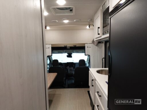 Whether you are traveling to your favorite campground or across the country, you are going to love this motorhome. You will have versatility in this coach to travel with a friend or your sweetheart with two twin beds that can easily convert to a king bed if you like. Each bed is 36" x 73" with a nightstand between and overhead storage along both sides and across the rear of the unit providing plenty of space for your things. There is also a wardrobe off the foot of the twin that is on the curbside. A sofa slide out with a table will provide a place to relax and dine together. The kitchen is opposite the slide on the door side and features a round hidden sink with solid surface cover for added prep space, a 12-volt 6 cu. ft. refrigerator for your perishables, and a microwave oven and induction cooktop for easy meals as you travel. When you want to get cleaned up, there is a bath with an angled shower, toilet, and sink, plus medicine cabinet for your toothbrush and razor.