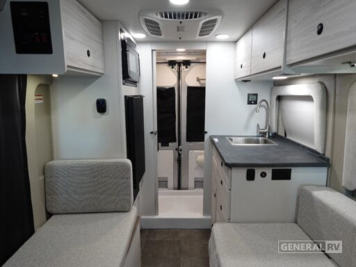 The center kitchen is equipped with a compact electric refrigerator and a single cooktop burner, ideal for preparing delightful meals on the go. The rear bath provides convenience with its wet bath setup, while the wardrobe offers ample storage for your travel essentials. Enjoy the great outdoors under the 10 ft. powered retractable awning, perfect for relaxing in the shade. With its sleek design and efficient use of space, the Entegra Coach ARC 18C is your ticket to freedom and exploration. For more details, visit your nearest General RV dealership.