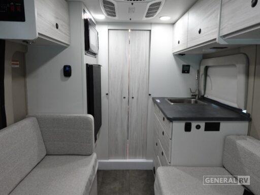 The center kitchen is equipped with a compact electric refrigerator and a single cooktop burner, ideal for preparing delightful meals on the go. The rear bath provides convenience with its wet bath setup, while the wardrobe offers ample storage for your travel essentials. Enjoy the great outdoors under the 10 ft. powered retractable awning, perfect for relaxing in the shade. With its sleek design and efficient use of space, the Entegra Coach ARC 18C is your ticket to freedom and exploration. For more details, visit your nearest General RV dealership.