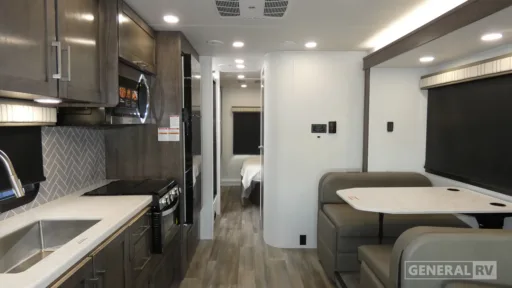 Enjoy a home on wheels with this motorhome! The rear private bedroom has a 60" x 74" queen bed slide to lay your head on at night and dual wardrobes opposite to keep your clothes looking their best. The separated bathroom makes it easy for one person to freshen up in the 30" x 36" shower while another uses the private toilet and sink. Prepare your best home cooked meals with the Furrion all-in-one cooktop and oven then enjoy them at the booth dinette. The theater seating offers a comfortable place to relax. There is also a bunk over cab for more to join in on the fun!