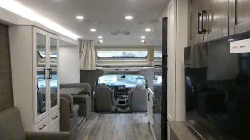 Enjoy a whole lot of comfort, fun and versatility in this coach! The queen Murphy bed and sofa combination allows you to convert between a living area and a bedroom, with a fireplace and an LED HD Smart TV. Outside, the exterior TV and 19' electric awning provide you an outdoor living space to enjoy nature and its beauty. The inside also provides a rear full bathroom including a space saving sliding door, linen storage, counter space for toiletries and a shower. You can dine at the U-shaped dinette or while sitting on the swivel captains chairs, and the cab-over bunk will be a perfect place to stay the night.