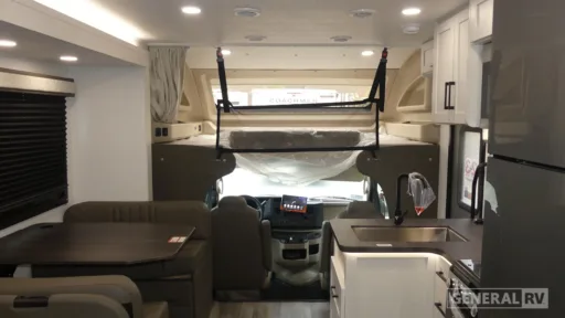 With any Odyssey Class C gas motorhome by Entegra Coach, the driver will appreciate the power from the 325 HP engine, the towing capacity from the 7,500 lb. hitch, the tire pressure monitoring system, the navigation from the Sony infotainment center with Apple CarPlay and Android Auto, plus the backup and side-view cameras when parking and driving down the highway. The kitchen offers full amenities including a recessed stainless steel sink with a cutting board sink cover, LED-lit pressed countertops, a decorative backsplash, and a pop-up charging station with 110 outlet and USB plugs to keep your smart phones charged. Get ready for luxury in a Class C, choose your favorite today!