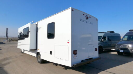 The Odyssey SE Class C gas motorhome by Entegra Coach is constructed with TuffShell vacuum-bond laminated sidewalls, a one-piece, seamless fiberglass front cap, and bead-foam insulation for added durability and strength. Whether you choose a model with a Ford E-350 chassis, Ford E-450 or Chevy 4500 chassis, you will get a durable coach made to last. The driver will also love the power steering, tilt steering wheel, and auxiliary start switch. The 7' interior ceiling height will provide plenty of space to stretch out and the high-intensity, recessed LED lights will make your space feel more like home. All of your power needs will be met with a 4,000-watt generator and 12V house battery, plus there is a 13.5K BTU A/C and 30K BTU furnace to keep you comfortable all year long. There are a couple additions you might want to add to further customize your Odyssey SE, like the optional automatic hydraulic leveling jacks and the optional 200W solar panel for some off-grid camping!