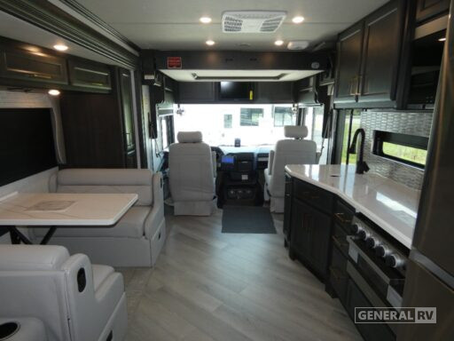As you move towards the rear, you'll find a serene bedroom retreat with a king-sized Serenity Series bed, ample wardrobe space, and a dedicated LED TV for those leisurely mornings. The center bath offers convenience with its shower and lavatory setup. With a robust Ford F53 chassis, 350 horsepower, and a towing capacity of 8,000 pounds, this motorhome is ready to take you wherever your heart desires. Plus, the 18 ft. powered retractable awning and exterior entertainment center make outdoor living as enjoyable as the indoors. For more details and to see it in person, visit your nearest General RV dealership.