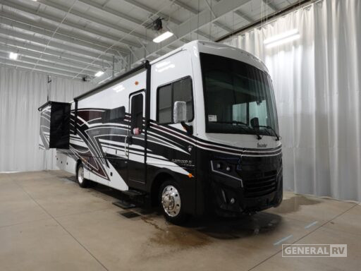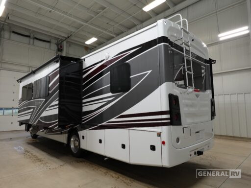 As you move towards the rear, you'll find a serene bedroom retreat with a king-sized Serenity Series bed, ample wardrobe space, and a dedicated LED TV for those leisurely mornings. The center bath offers convenience with its shower and lavatory setup. With a robust Ford F53 chassis, 350 horsepower, and a towing capacity of 8,000 pounds, this motorhome is ready to take you wherever your heart desires. Plus, the 18 ft. powered retractable awning and exterior entertainment center make outdoor living as enjoyable as the indoors. For more details and to see it in person, visit your nearest General RV dealership.