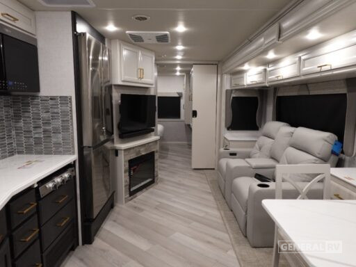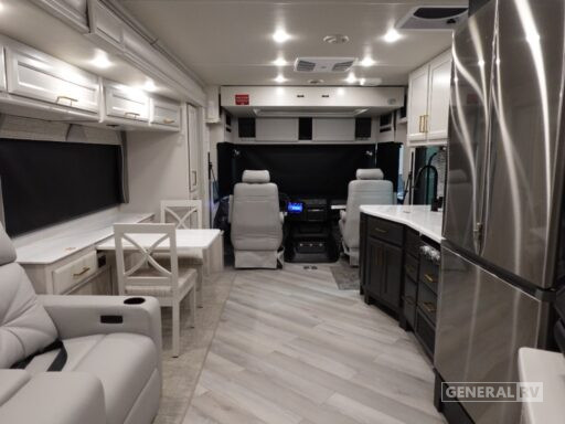 As you move towards the rear, you'll find a serene bedroom retreat with a king-sized Serenity Series bed, ample wardrobe space, and a dedicated LED TV for those leisurely mornings. The center bath offers convenience with its shower and lavatory setup. With a robust Ford F53 chassis, 350 horsepower, and a towing capacity of 8,000 pounds, this motorhome is ready to take you wherever your heart desires. Plus, the 18 ft. powered retractable awning and exterior entertainment center make outdoor living as enjoyable as the indoors. For more details and to see it in person, visit your nearest General RV dealership.