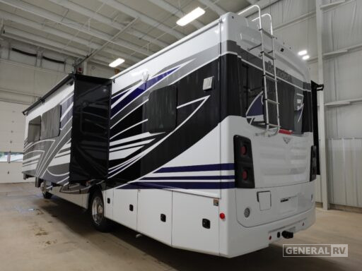 As you move towards the rear, you'll find a serene bedroom retreat with a king-sized Serenity Series bed, ample wardrobe space, and a dedicated LED TV for those leisurely mornings. The center bath offers convenience with its shower and lavatory setup. With a robust Ford F53 chassis, 350 horsepower, and a towing capacity of 8,000 pounds, this motorhome is ready to take you wherever your heart desires. Plus, the 18 ft. powered retractable awning and exterior entertainment center make outdoor living as enjoyable as the indoors. For more details and to see it in person, visit your nearest General RV dealership.