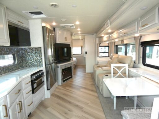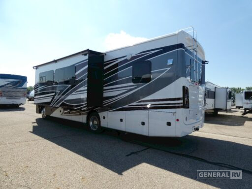 As you move towards the rear, you'll find a serene bedroom retreat with a king-sized Serenity Series bed, ample wardrobe space, and a dedicated LED TV for those leisurely mornings. The center bath offers convenience with its shower and lavatory setup. With a robust Ford F53 chassis, 350 horsepower, and a towing capacity of 8,000 pounds, this motorhome is ready to take you wherever your heart desires. Plus, the 18 ft. powered retractable awning and exterior entertainment center make outdoor living as enjoyable as the indoors. For more details and to see it in person, visit your nearest General RV dealership.