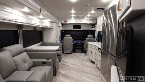 As you move towards the rear, you'll find a serene bedroom retreat with a king-sized Serenity Series bed, ample wardrobe space, and a dedicated LED TV for those leisurely mornings. The center bath offers convenience with its shower and lavatory setup. With a robust Ford F53 chassis, 350 horsepower, and a towing capacity of 8,000 pounds, this motorhome is ready to take you wherever your heart desires. Plus, the 18 ft. powered retractable awning and exterior entertainment center make outdoor living as enjoyable as the indoors. For more details and to see it in person, visit your nearest General RV dealership.