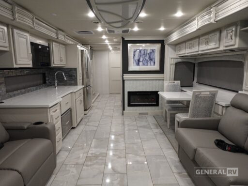 The 2026 Fleetwood Discovery 38W is a masterpiece of luxury and functionality, crafted for those who seek adventure without sacrificing comfort. This nearly 41-foot diesel pusher is built on the robust Freightliner Freedom Bridge chassis, powered by a mighty Cummins I6 engine delivering 360 horsepower and 800 lb-ft of torque. Its sleek design is complemented by an 18-foot powered retractable awning, offering a perfect outdoor space for relaxation. The interior is designed to accommodate up to 10 people comfortably, featuring a king bed, queen bed, and convertible sleeping areas, ensuring everyone has a cozy spot to rest.