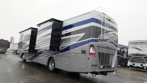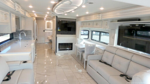 With any Fleetwood Discovery Class A diesel motorhome, the Freedom Bridge custom chassis, the V-Ride suspension, and the Cummins B6.7 engine offer a smooth and enjoyable ride to all your destinations. The construction also includes a one-piece fiberglass exterior roof with a sleek appearance, low maintenance, and long-lasting durability. The interior cabin includes full hand-laid porcelain flooring throughout and a heated floor in the living area, making traveling convenient. And you will love the residential-style furniture by Apex Custom Furniture interior decor. Additionally, these models feature three 15,000 BTU A/C units with rear heat pump, large holding tank capacities, and generous interior and exterior storage, making them ideal for storing all your gear. Choose to travel and live better in a Discovery!
