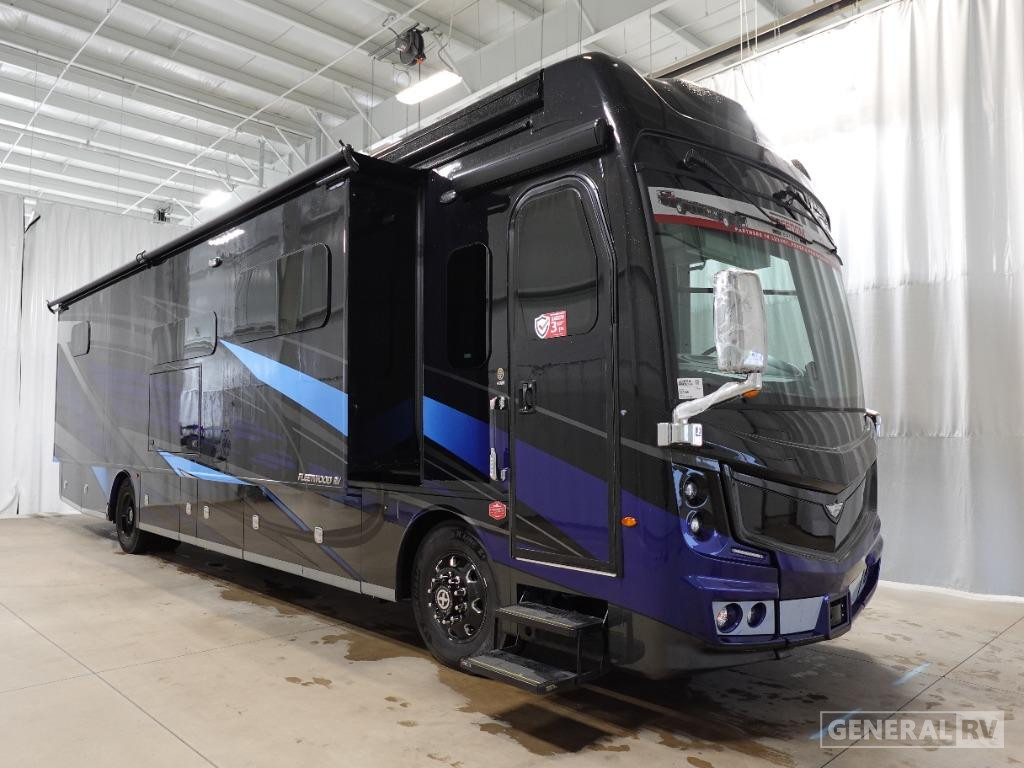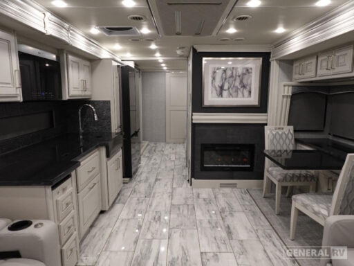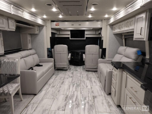 The Discovery LXE 40M is equipped with a modern kitchen that boasts a convection microwave and a residential refrigerator, perfect for preparing gourmet meals on the go. The elegant design extends to the bathroom, where you’ll find a stylish shower with glass doors. With an 18 ft. powered retractable awning, outdoor enjoyment is just a button press away. Powered by a robust Cummins I6 Diesel Pusher engine on a Freightliner XC-Series chassis, this RV promises a smooth and powerful drive, whether cruising down highways or exploring scenic byways. Visit your nearest General RV dealership to discover more about this exceptional motorhome.