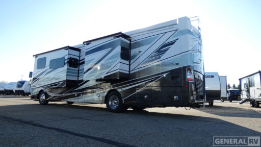 The Discovery LXE 40M is equipped with a modern kitchen that boasts a convection microwave and a residential refrigerator, perfect for preparing gourmet meals on the go. The elegant design extends to the bathroom, where you’ll find a stylish shower with glass doors. With an 18 ft. powered retractable awning, outdoor enjoyment is just a button press away. Powered by a robust Cummins I6 Diesel Pusher engine on a Freightliner XC-Series chassis, this RV promises a smooth and powerful drive, whether cruising down highways or exploring scenic byways. Visit your nearest General RV dealership to discover more about this exceptional motorhome.