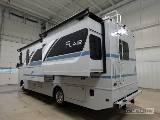 Inside, the Flair 28A is designed for both comfort and convenience. The center kitchen is equipped with a three-burner cooktop and a mid-size refrigerator powered by propane, ensuring you have everything you need to prepare delicious meals on the go. The rear bathroom offers a practical shower with a plastic/glass enclosure, while the rear bedroom provides a private retreat with ample wardrobe space. The exterior features a 20-foot powered retractable awning, perfect for enjoying the outdoors in comfort. With a tow capacity of 8,000 lbs, you can easily bring along your favorite outdoor toys. This RV is the perfect blend of style, functionality, and adventure-readiness.