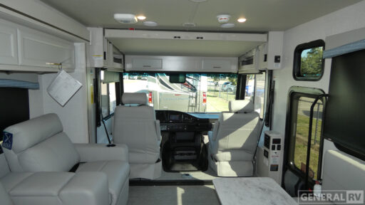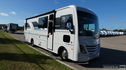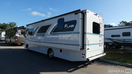 The center kitchen is a culinary enthusiast's dream, equipped with a mid-size residential refrigerator and a three-burner cooktop. The layout is designed for seamless living, with a front living area perfect for relaxation and a center bath for convenience. Outside, the 20 ft. powered retractable awning provides ample shade, making it easy to enjoy the exterior kitchen and LED TV for outdoor entertainment. Built on a robust Ford F53 chassis with a powerful 335 horsepower engine, this RV offers a smooth ride and impressive towing capacity. Visit your nearest General RV dealership to explore the Fleetwood Flair 29M and start your journey today!