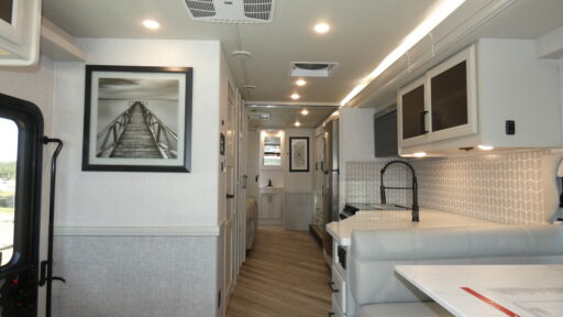 The Fleetwood Fortis Class A gas motorhome is a powerhouse of luxury and convenience, and it also is quite literally a powerhouse with its Ford 7.3L V8 335HP engine with 468 LB/FT of torque. The construction includes a Dryseal edge coating for all ceilings, walls, and floor, and the Powerlock System 2 has interlocking walls to the roof for stability. Automatic hydraulic leveling jacks make the set-up process easier, and you'll love the new captain's seats by Villa. You will find vinyl tile flooring all throughout the interior, as well as full-extension drawer guides with latches, coordinating window treatments, and energy-efficient LED flush-mount ceiling lighting.