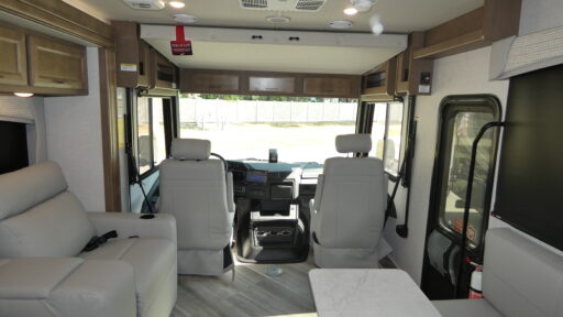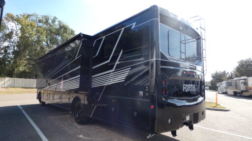 Step towards the rear, and you'll discover a serene bedroom featuring a Queen bed, complemented by additional convertible sleeping options and cozy bunks. The center bath, with its sleek plastic and glass shower, offers convenience and style. This RV is prepped for a washer and dryer, adding to its practical appeal. With a robust Ford F53 chassis, 335 horsepower, and an 8,000-pound towing capacity, the Fortis 36Y is as powerful as it is elegant. The 12 ft. powered retractable awning invites you to enjoy the outdoors, while the exterior kitchenette enhances your alfresco dining experience. For more details, visit your nearest General RV Dealership Location.