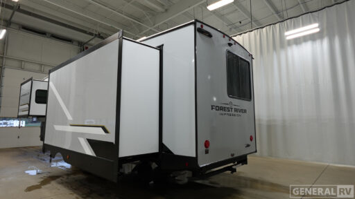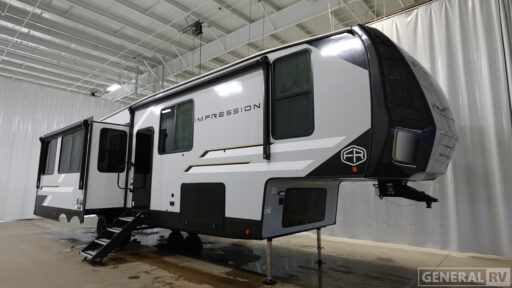 With any Impression fifth wheel by Forest River, the focus of the design is comfort and value, built with quality craftsmanship and attention to customer's desires in each Impression! The exterior includes upgraded E-rated tires, custom exterior graphics package, and insulated slam latch baggage doors. There is also an enclosed docking station, an outside shower, and a 100W roof panel for off-grid capabilities. The fully heated and enclosed AccessiBelly has removable underbelly panels along with enclosed tank valves. There is an industry leading 15K A/C plus 35K BTU furnace to keep you comfortable. The interior has lumbercore cabinetry, residential linoleum, residential backsplash in the kitchen, and oversized opening windows in the living area for more natural lighting and good air flow.