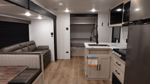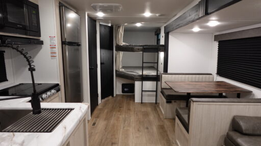 If you're looking for more space, this double axle unit features a large slide so you can walk about freely. Here, you'll find the booth dinette and sofa, which sit across from the optional TV if you want to enjoy movie nights. The full kitchen includes a microwave and three burner cooktop to make meals, plus a pantry and 12V refrigerator for food storage. There is even washer and dryer prep in the pantry if you choose to add these appliances. The kids or your guests will love the double-size bunks, and the full bath right beside the bunks includes one of the dual entry doors so you can easily get back out to the fun!