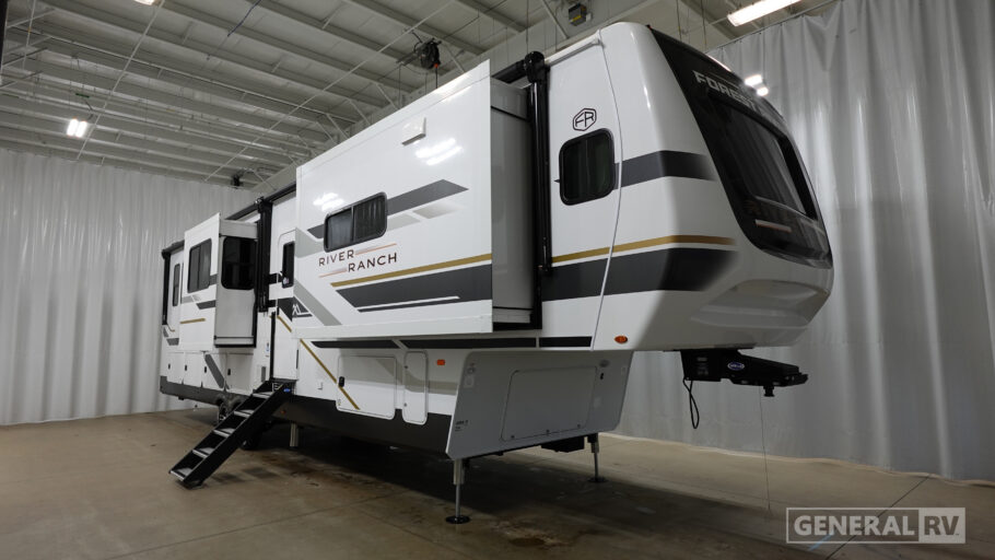 With the River Ranch fifth wheel by Forest River, you will love the practical living, ample storage, the optimum towability, and the lavish style found throughout! There is a 7' interior height and a 101" wide body for added space, plus large, tinted windows throughout, worry-free composite floors, and vacuum bonded walls with Azdel for durability. The mandatory River Package includes features such as an upgraded suspension, a screenless operating system with Bluetooth, and three A/C units to keep you comfortable. These fifth wheels also include the mandatory Ranch Package that comes with a stainless-steel appliance package, day/night roller shades, a fiberglass shower surround, plus residential style dinette chairs. There are many more features to love about the River Ranch fifth wheels, like the upgraded true solid surface countertops, the mirrored sliding closet doors, and the two-tone painted front cap!