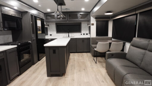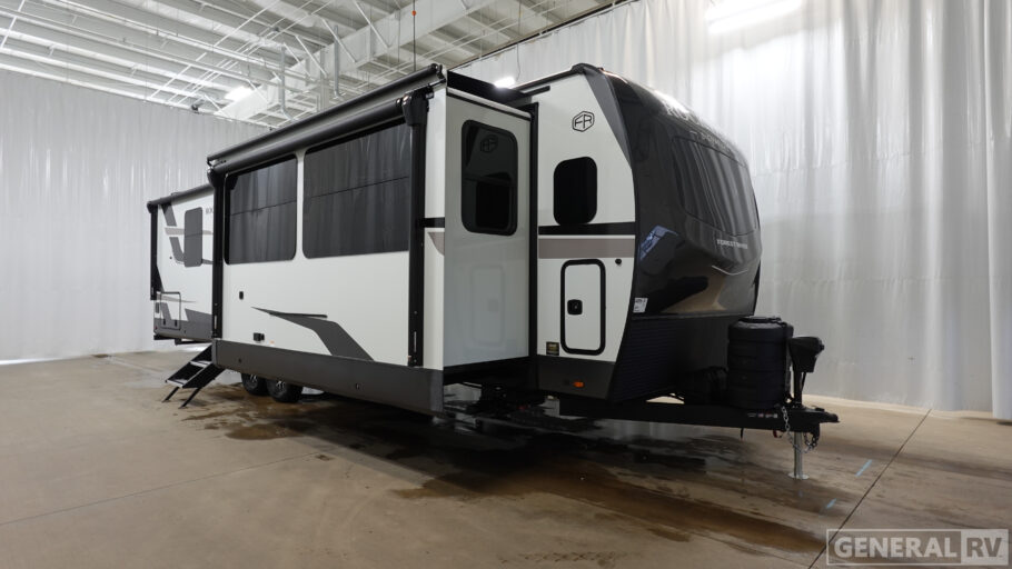 The master suite is a sanctuary of its own, boasting a king-sized bed and abundant storage options, including a wardrobe prepped for a washer/dryer. The thoughtfully designed bathroom offers convenience and comfort, ensuring you feel at home wherever your adventures take you. With three slides and two awnings, outdoor living is as enjoyable as the indoors, providing shade and space for alfresco dining or simply soaking in the natural surroundings. Ready to embark on your next journey? Visit your nearest General RV dealership to explore this remarkable travel trailer in person.