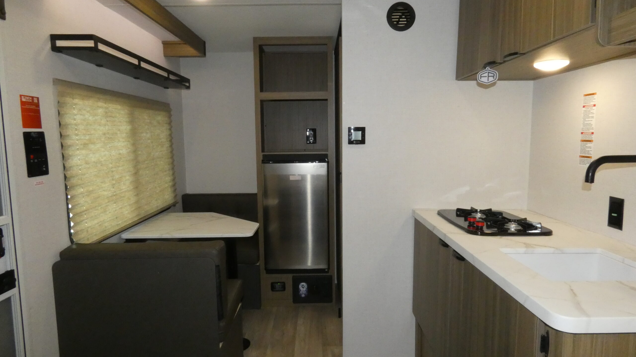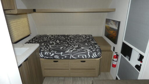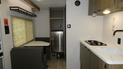 This lightweight travel trailer has everything you need to enjoy camping trips! There is a front east to west custom queen bed with storage at the foot of the bed and overhead for your valuables. A private bath includes a toilet and walk-in shower so you can easily get ready each day, and you can prepare your meals on the two-burner cooktop when you get hungry. The booth dinette will provide dining space. Don't let this trailer get away!