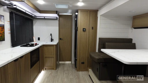 It will be so easy to enjoy time spent in this travel trailer for three. The front queen bed provides a great night's rest, and there is an overhead cabinet to keep your things organized. A two-burner cooktop in the kitchen will let you make meals for your crew, and a refrigerator keeps leftovers fresh. You can dine at the booth dinette within the slide out or take your plate outdoors to sit under the 12' power awning. And a full rear bath with a shower, toilet, and large vanity counter lets you stay clean each day!