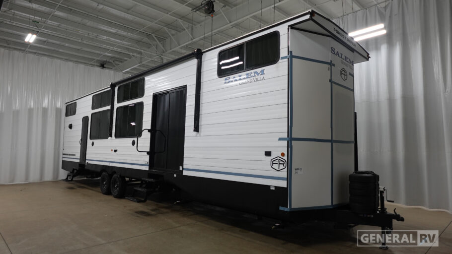 Discover the ultimate in comfort and style with the 2026 Forest River Salem Grand Villa 42ICE. This spacious RV is designed for families and adventurers alike, offering ample room for up to seven sleepers. Its expansive 45-foot length is crafted to provide a luxurious home-away-from-home experience. The centerpiece is the elegant living area featuring a sectional sofa and a cozy fireplace, perfect for relaxing after a day of exploration. The innovative Tele-Vator ensures your entertainment needs are met with a touch of modern flair.