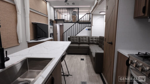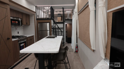 Venture into the well-appointed kitchen, where you'll find abundant counter space and storage, making meal prep a breeze. The king bed with Versa Tilt in the master suite promises restful nights, while the loft area, complete with bunk mats and storage, is perfect for the kids or guests. With a walk-in shower and washer/dryer, this RV combines practicality with luxury. Enjoy the great outdoors under the generous awning, making every moment memorable. For more details, visit your nearest General RV dealership.