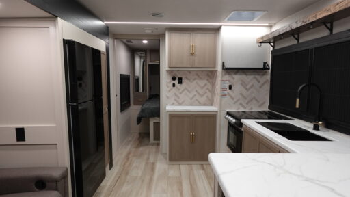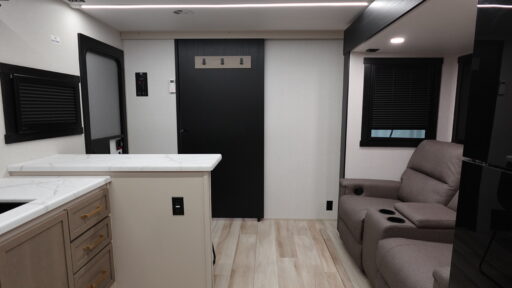 At the front of this well-designed trailer, a private bedroom offers a cozy 60" x 80" queen bed for a restful night’s sleep, complemented by overhead cabinets and a wardrobe for neatly storing clothing and essentials. Moving into the center, a spacious slide-out opens up the living area and houses a comfortable theater seat perfect for lounging after a day of adventure along with a 10 cu. ft. refrigerator and pantry to keep all your groceries and dry goods organized. Across from this space, the L-shaped kitchen provides everything you need to cook your favorite meals, featuring a three-burner range, a residential-style single-bowl undermount sink, and elegant Nordic marble countertops. At the end of the kitchen, a convenient bar top with stools creates a welcoming spot to enjoy meals or unwind with a drink. Toward the rear, the full bathroom adds a touch of luxury with a porcelain toilet, dual sinks, and an LED backlit mirror, allowing two people to get ready comfortably and without the morning rush.