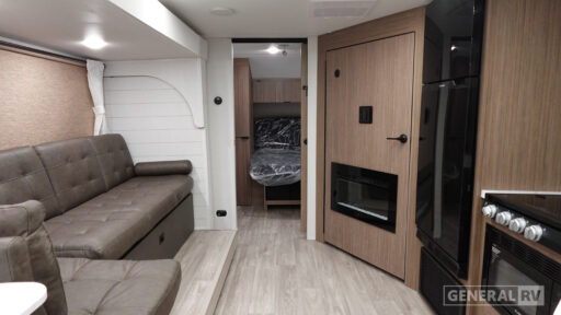 You're sure to make camping memories in this spacious travel trailer! You can sleep four to five people each night thanks to the custom king bed with Versa Tilt in the front bedroom plus the Versa-Lounge and booth dinette within the large slide out! The full kitchen will let you make meals each day, and you'll appreciate the hidden pantry with shelves behind the fireplace. And don't overlook the full rear bath, complete with a tub/shower and ample counter space for your things.