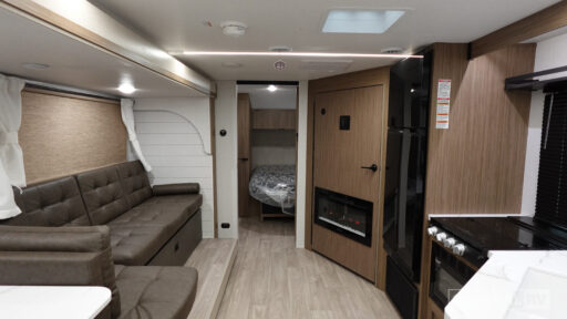 You're sure to make camping memories in this spacious travel trailer! You can sleep four to five people each night thanks to the custom king bed with Versa Tilt in the front bedroom plus the Versa-Lounge and booth dinette within the large slide out! The full kitchen will let you make meals each day, and you'll appreciate the hidden pantry with shelves behind the fireplace. And don't overlook the full rear bath, complete with a tub/shower and ample counter space for your things.