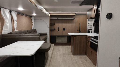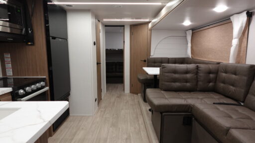 If you like to travel with a large crew, choose this Wildwood X-Lite travel trailer! This trailer has two private sleeping spaces with a private bedroom up front and a private bunkhouse in the back. Not only does the bunkhouse have three bunk beds, but it also has a closet for storage and a jiffy sofa for lounging. In the main living area, there is a large slide that holds the booth dinette and sofa. These pieces of furniture are a part of the Versa Lounge, and you can customize them to function as you need them to. The panoramic windows surround the dinette and sofa so that you can take in the scenic views while you relax.