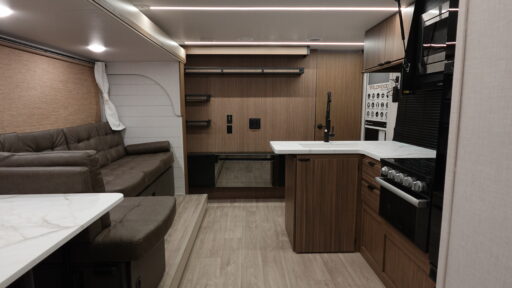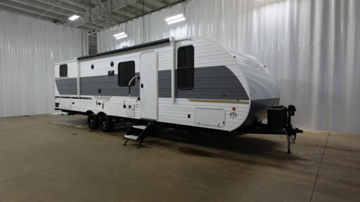 If you like to travel with a large crew, choose this Wildwood X-Lite travel trailer! This trailer has two private sleeping spaces with a private bedroom up front and a private bunkhouse in the back. Not only does the bunkhouse have three bunk beds, but it also has a closet for storage and a jiffy sofa for lounging. In the main living area, there is a large slide that holds the U-shaped dinette and sofa. These pieces of furniture are a part of the Versa Lounge, and you can customize them to function as you need them to. The panoramic windows surround the dinette and sofa so that you can take in the scenic views while you relax. You even have an outdoor camp kitchen to make it more convenient.