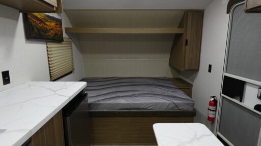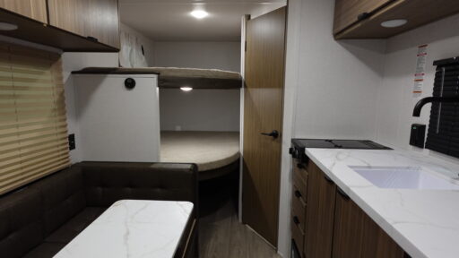 The double-size bunks with storage will be a big selling point in this travel trailer! While your guests take the bunks, you can have the front queen bed all to yourselves, and there is a wardrobe to keep your things organized. A two-burner cooktop and microwave will let you make meals each day, and you can dine at the open lounge with a table.