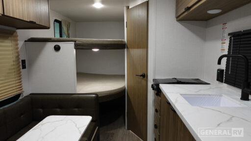 The double-size bunks with storage will be a big selling point in this travel trailer! While your guests take the bunks, you can have the front queen bed all to yourselves, and there is a wardrobe to keep your things organized. A two-burner cooktop and microwave will let you make meals each day, and you can dine at the open lounge with a table.