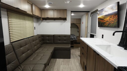 The central living and kitchen area features a spacious U-shaped dinette perfect for meals, games, or lounging, with ample storage overhead and a well-appointed galley that includes a residential-style refrigerator and cooktop, plus a convection microwave for easy meal prep. A full bath with standard RV shower adds everyday convenience, and outside, the 12′ power awning expands your camp living space for outdoor dining or relaxation. With solid utility capacities, smart storage, and comfortable accommodations throughout, the Wildwood FSX 266BHLE delivers adventure-ready comfort wherever the road takes you.