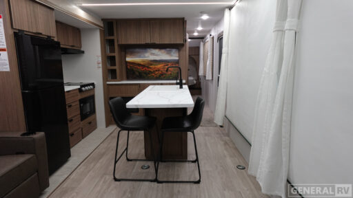 Kitchen Island Bunk Beds King Bed Full Pass-Through Storage 22' Power Awning with LED Lights Smooth Fiberglass Exterior